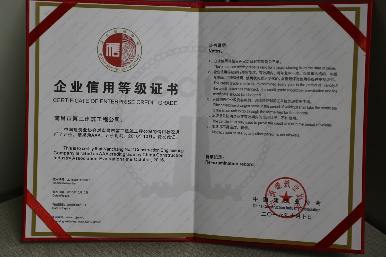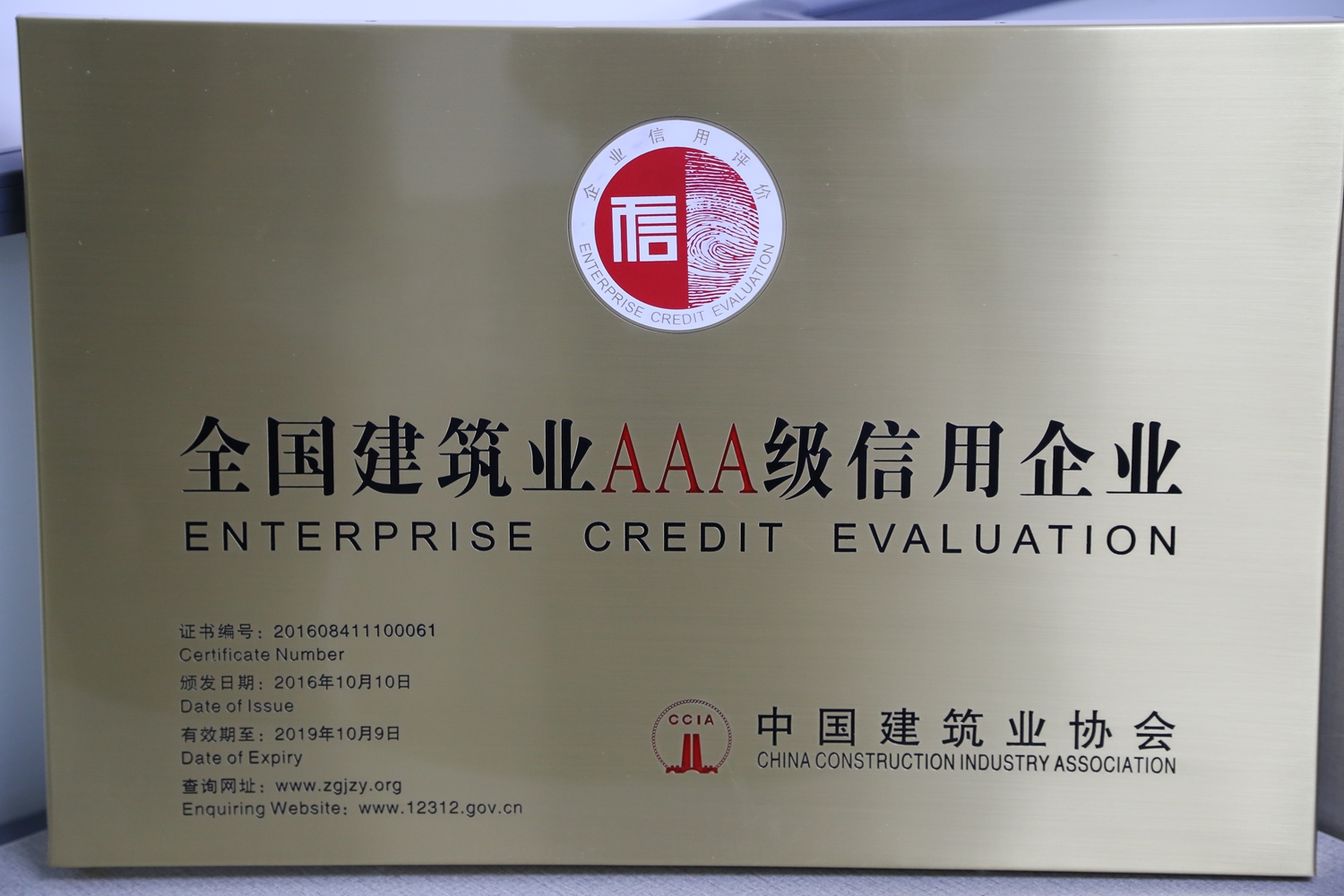 企業(yè)信用等級(jí)是由中國建筑業(yè)協(xié)會(huì)經(jīng)審核、篩選和評(píng)定而確定的,有效期3年,每年復(fù)審一次。由于公司一直本著誠信、服務(wù)、質(zhì)量為上的原則,獲得了中國建筑業(yè)協(xié)會(huì)及社會(huì)大眾的認(rèn)可,2016年10月公司再度榮獲“AAA級(jí)信用企業(yè)”的榮譽(yù)稱號(hào)。這個(gè)全國建筑行業(yè)都為數(shù)不多的榮譽(yù)是對(duì)我們企業(yè)的肯定及嘉獎(jiǎng),讓我們樹起信譽(yù)旗幟,再創(chuàng)輝煌,攜手走得更好、更遠(yuǎn)。