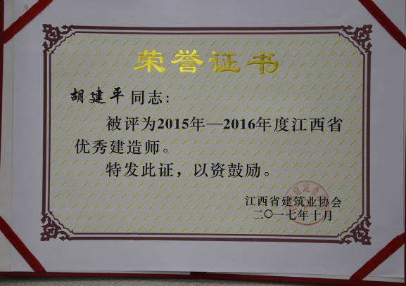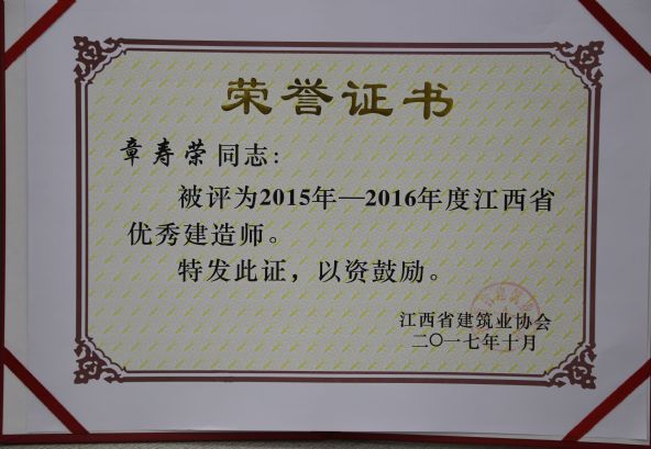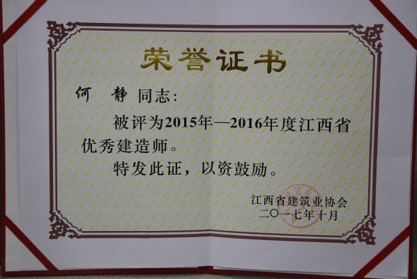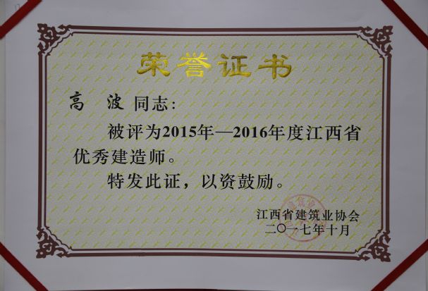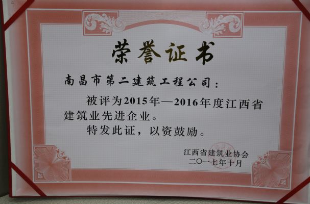江西省建筑業(yè)協(xié)會對公司頒發(fā)了2015-2016年度江西省建筑業(yè)先進企業(yè)榮譽稱號,對公司建造師何靜、胡建平、高波、章壽榮頒發(fā)了2015-2016年度江西省優(yōu)秀建造師榮譽稱號。