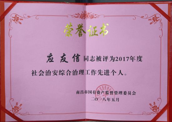 公司社會治安綜合治理和信訪工作榮獲國資委2017年度先進單位,陳國明、應(yīng)友信同志榮獲國資委2017年度先進個人稱號。
